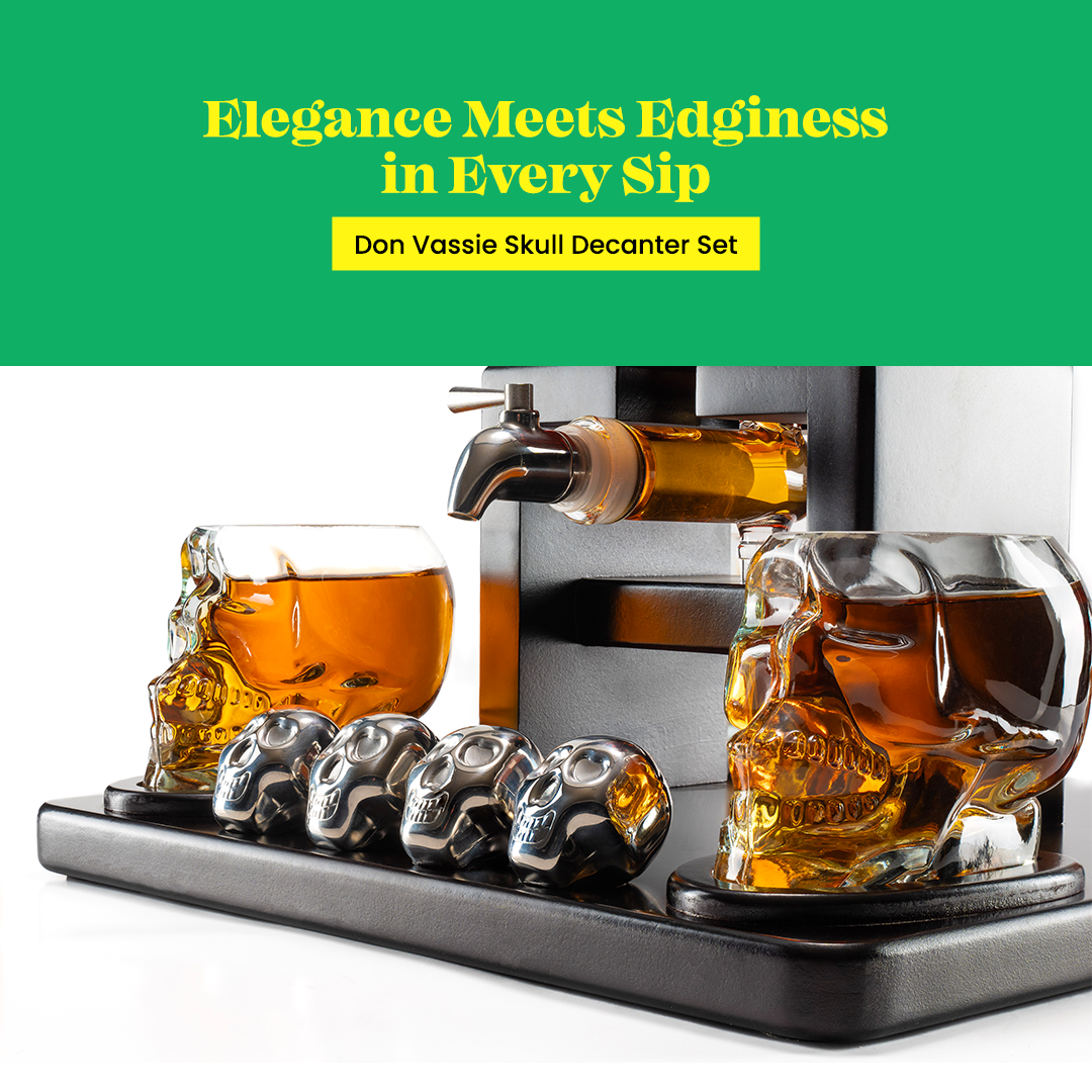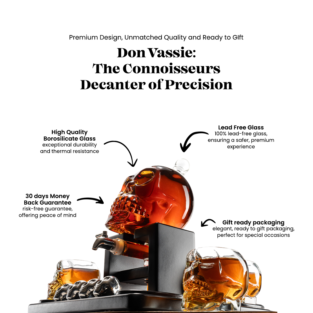 - Elegant Decanter: Welcome your guests with a bold statement. The Don Vassie Skulls are crafted for those who wish to move away from the mundane and are willing to experiment with the macabre. Let the tap of the Don Vassie Skull serve your finest liquors in the most unique fashion possible.